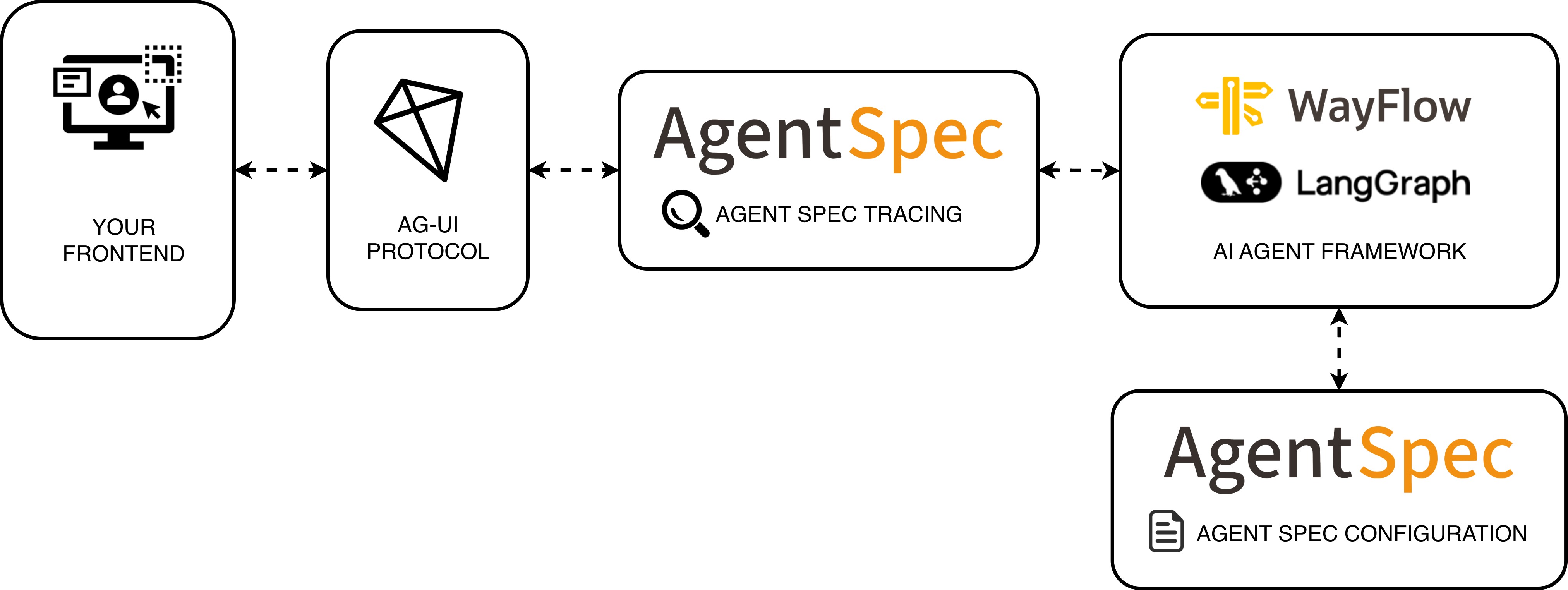With the Agent Spec x AG-UI integration, you can take a portable Agent Spec configuration (JSON) and interact with it in AG-UI frontends, while keeping your choice of runtime (LangGraph, WayFlow). The adapter bridges Agent Spec Tracing and AG-UI events so frontends receive standardized messages, tool activity, and UI state without bespoke wiring.