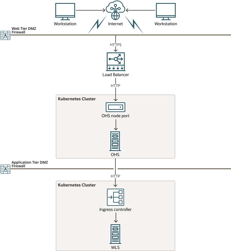 Note: The load balancer is optional and you can connect direct to the OHS nodeport if required, either from workstations outside the firewall, or internally from other applications.