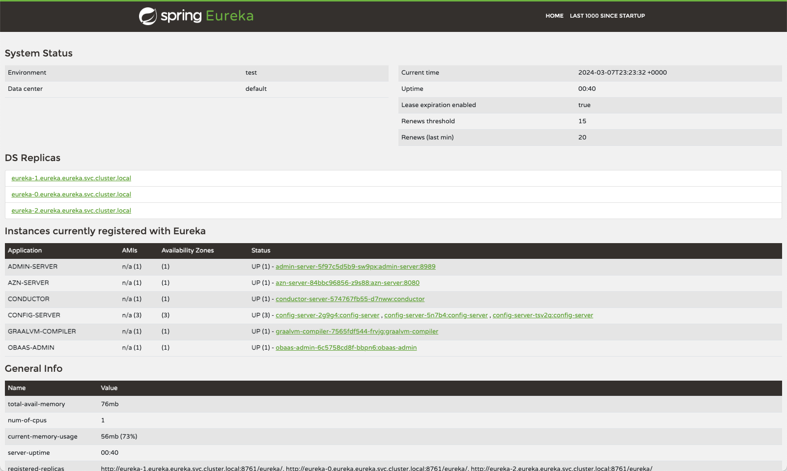 Oracle Backend for Microservices and AI includes the Spring Boot Eureka service registry, which is an application that stores information about client services or applications. Typically, each Microservice registers with the Eureka server at startup and the Eureka server maintains a list of all active instances of the service, including their ports and IP addresses. This information can be accessed by other services using a well-known key. This allows services to interact with each other without needing to know the other addresses at development or deployment time.