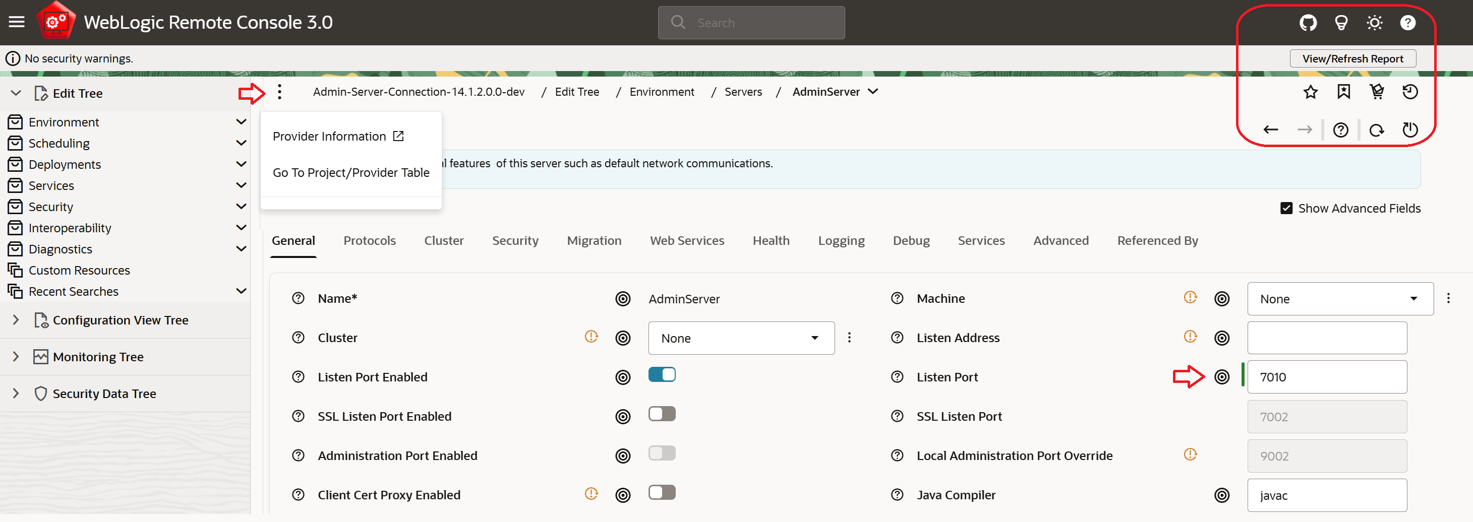 Clearer and sharper icons: Icons throughout WebLogic Remote Console have been updated to more clearly convey their functions. See Page Icons and Field Icons.